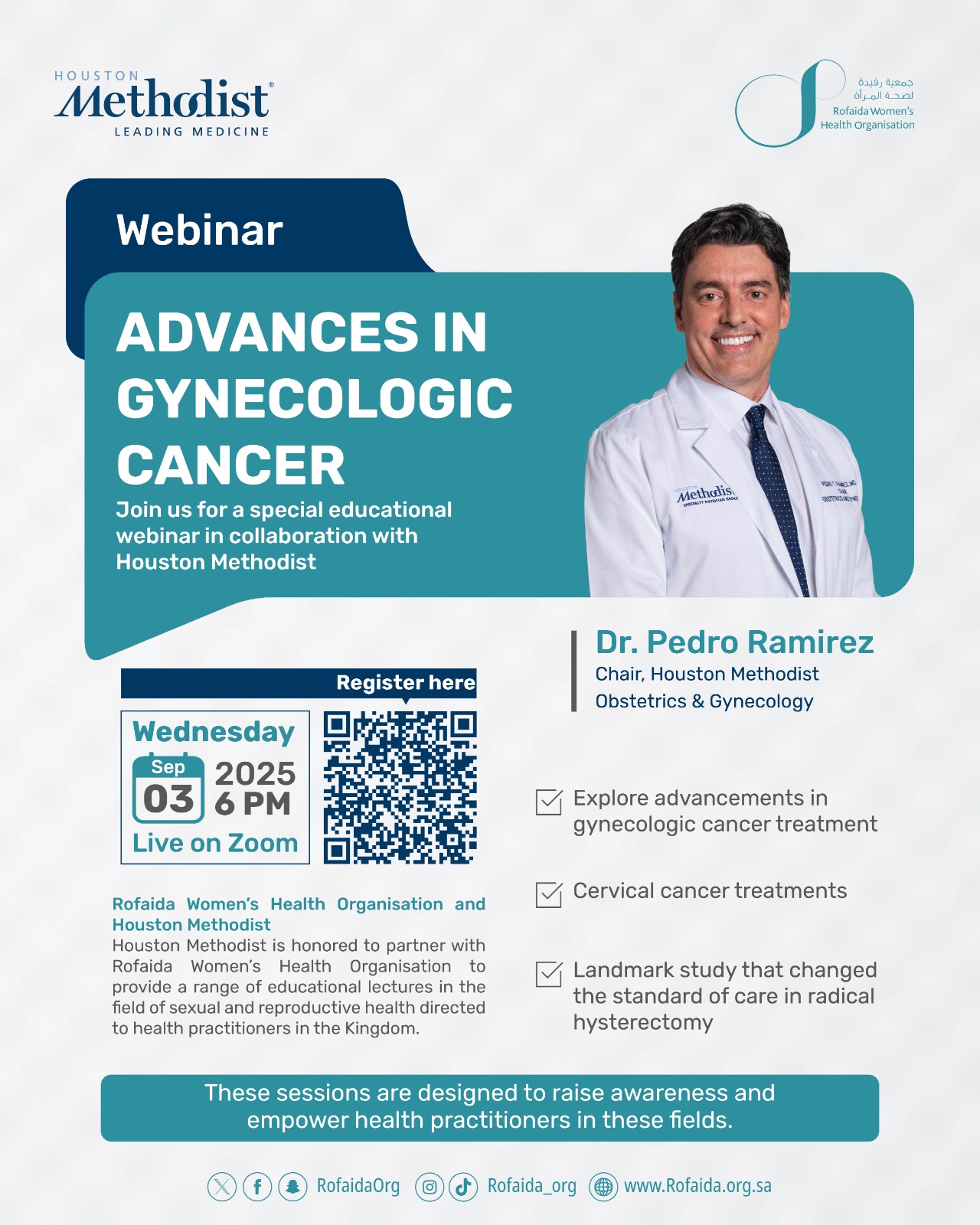 تفخر جمعية رفيدة لصحة المرأة بتعاونها مع مستشفى هيوستن ميثوديست لتقديم مجموعة من المحاضرات التعليمية في مجال الصحة الجنسية والإنجابية و الموجهة للممارسين الصحيين في المملكة لرفع الوعي وتمكين الممارسين الصحيين في هذه المجالات